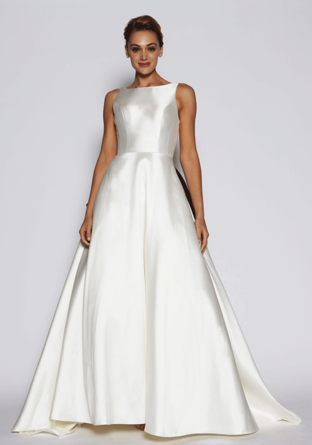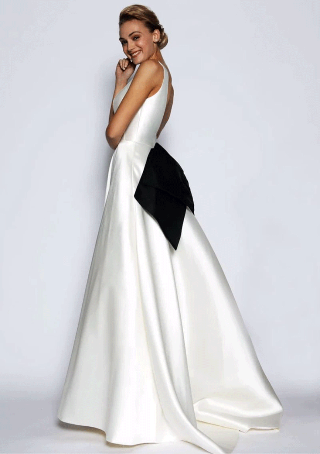 Freda Bennet FB81 ‘Manhatten’ Classical Aline wedding dress with Boat neckline and low back. Striking black organza bow complete this beautiful old hollywood design