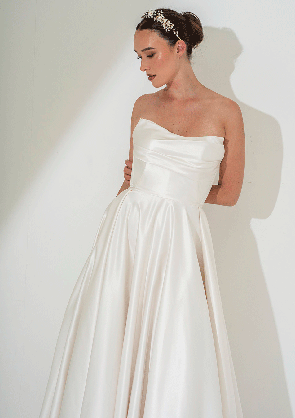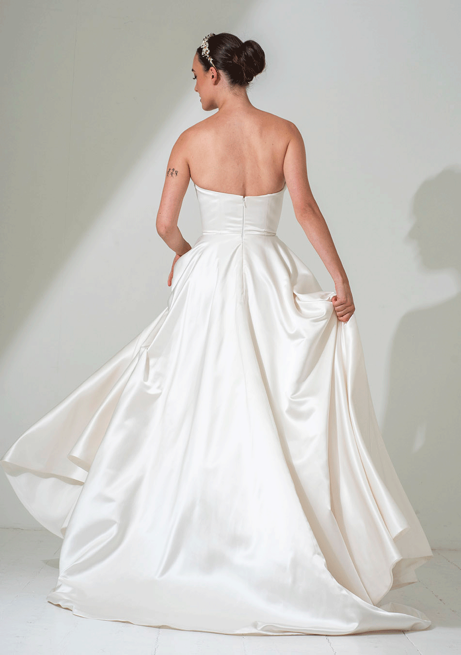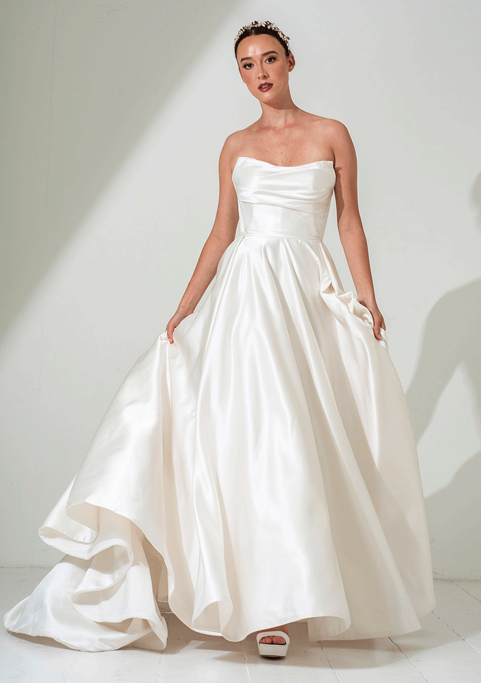 Freda Bennet FB251 ‘Remi’ – A Luxurious Satin bridal dress with strapless bodice and full circular cut skirt with pockets
