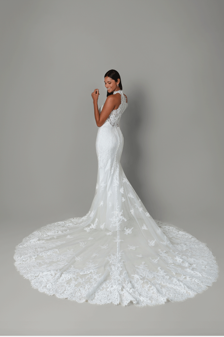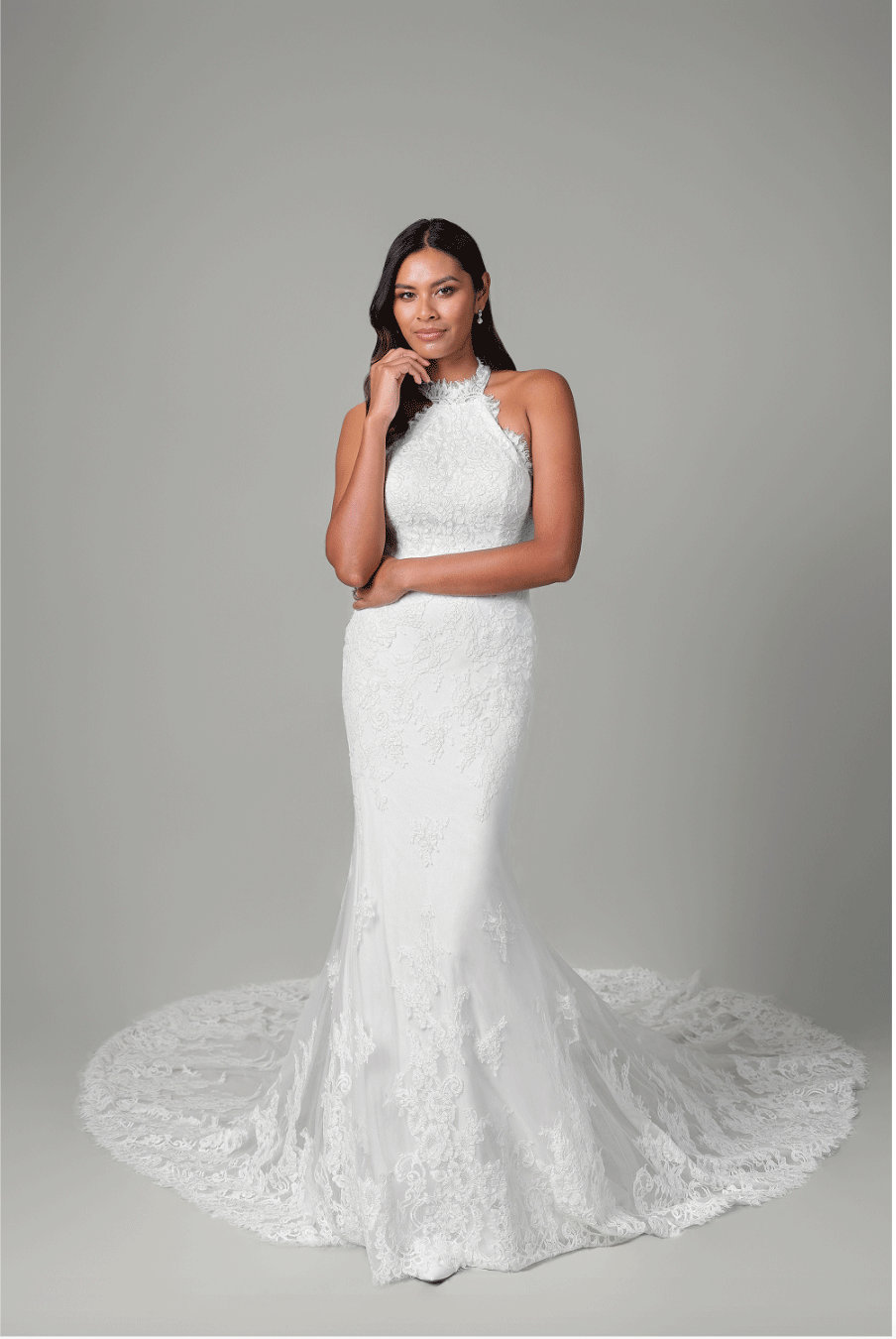 Justin Alexander 55213 ‘Reese’ stunning lace fit and flare wedding dress with jewel neckline and sheer racerback. A scalloped lace with eyelash trim details neckline and finishes hem. Dress complete with jersey comfort lining and tulle covered buttons extending down back to end of cathedral length train.
