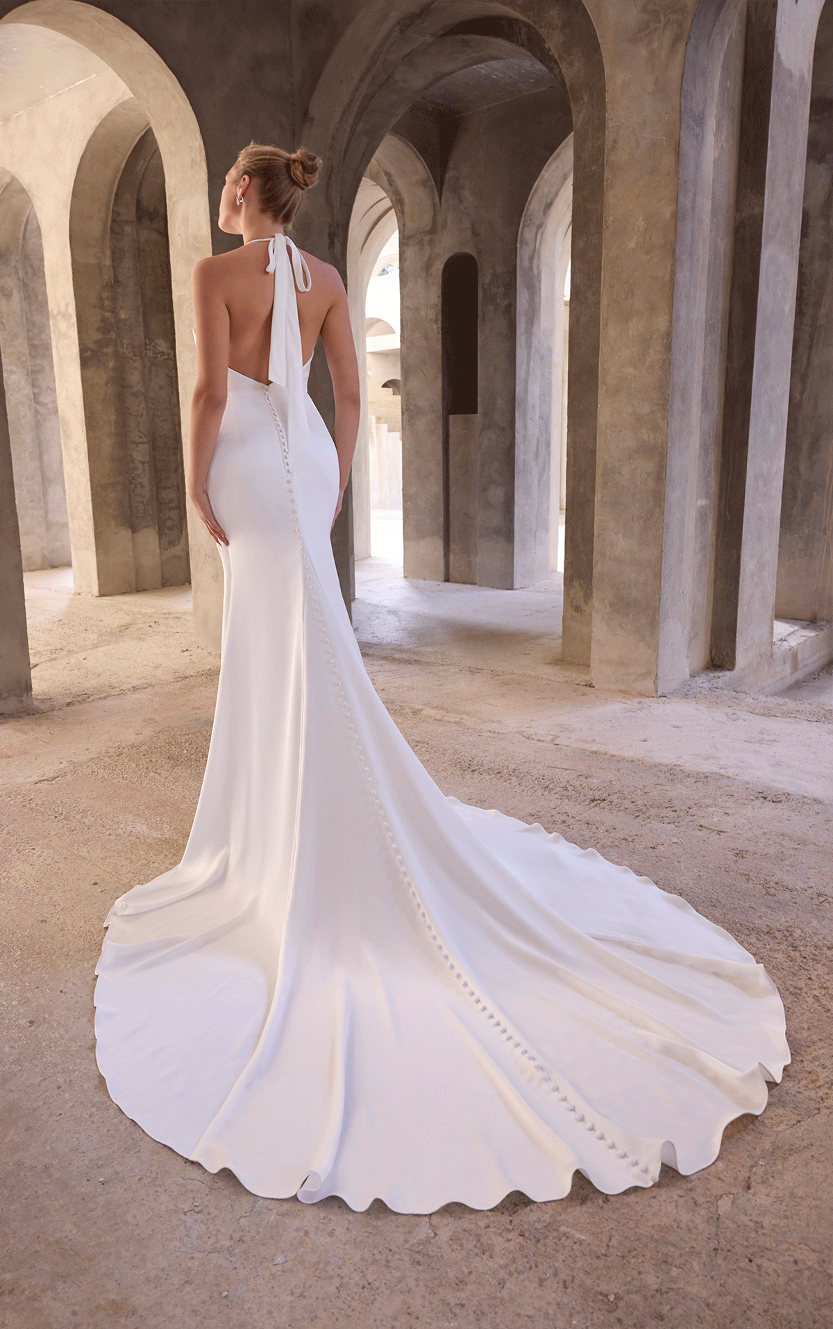 This is a sheath wedding dress that radiates understated elegance. The gown features a high halter neckline that gracefully transitions into a draped bodice, tied delicately at the neck for a flattering, sculpted effect. The skirt is crafted in soft satin, tailored to skim the body with gentle movement, and includes a subtle side slit that adds a hint of modern drama. A sweeping train completes the look, offering graceful flow without overwhelming volume.