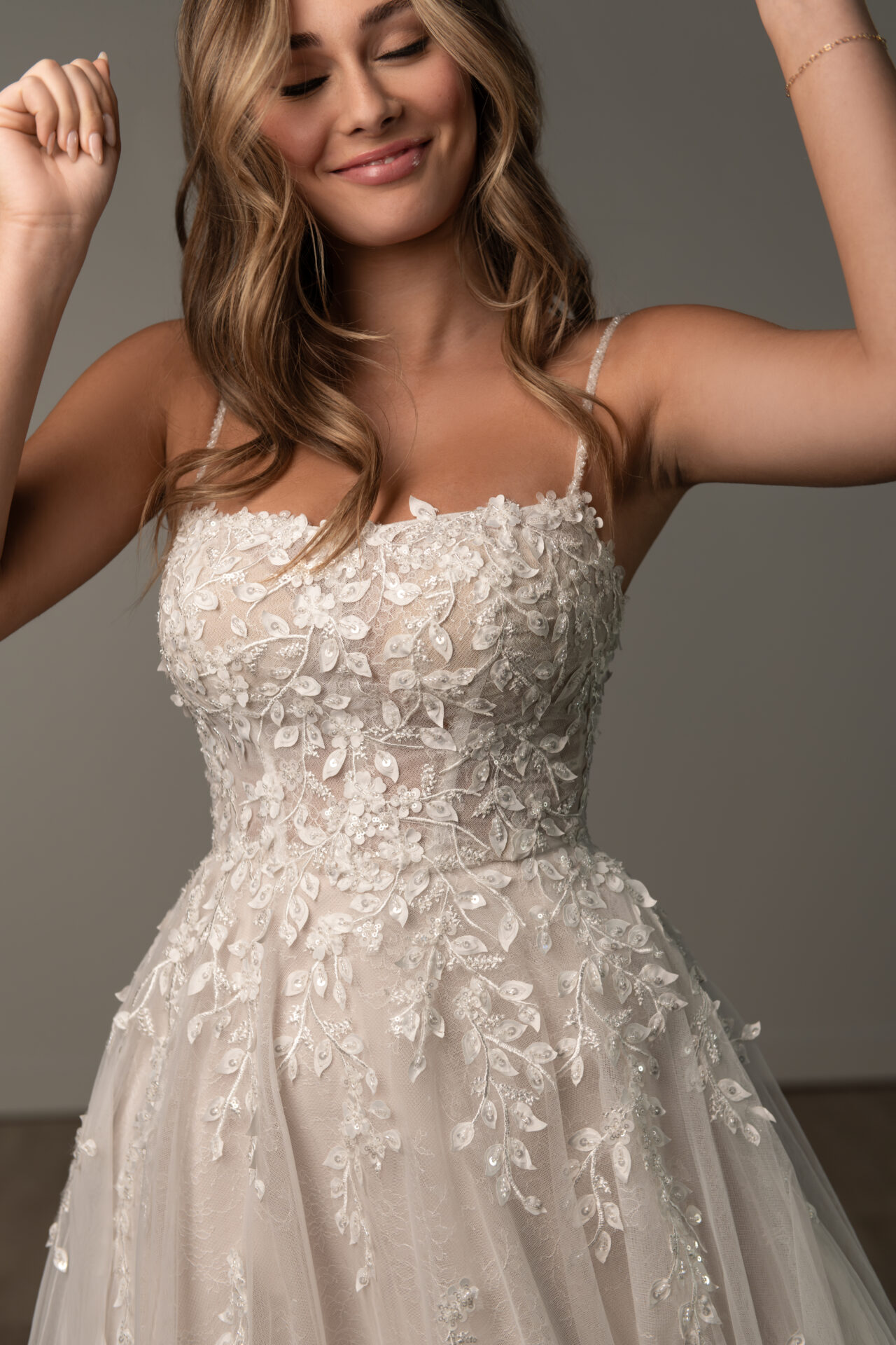Stella York SY8105 ‘Mimi’  Chantilly lace Aline wedding dress with appliqued Tulle overlay. A simple straight square neckline bodice with spaghetti straps is adorned with lace and a scattering of crystal beading.