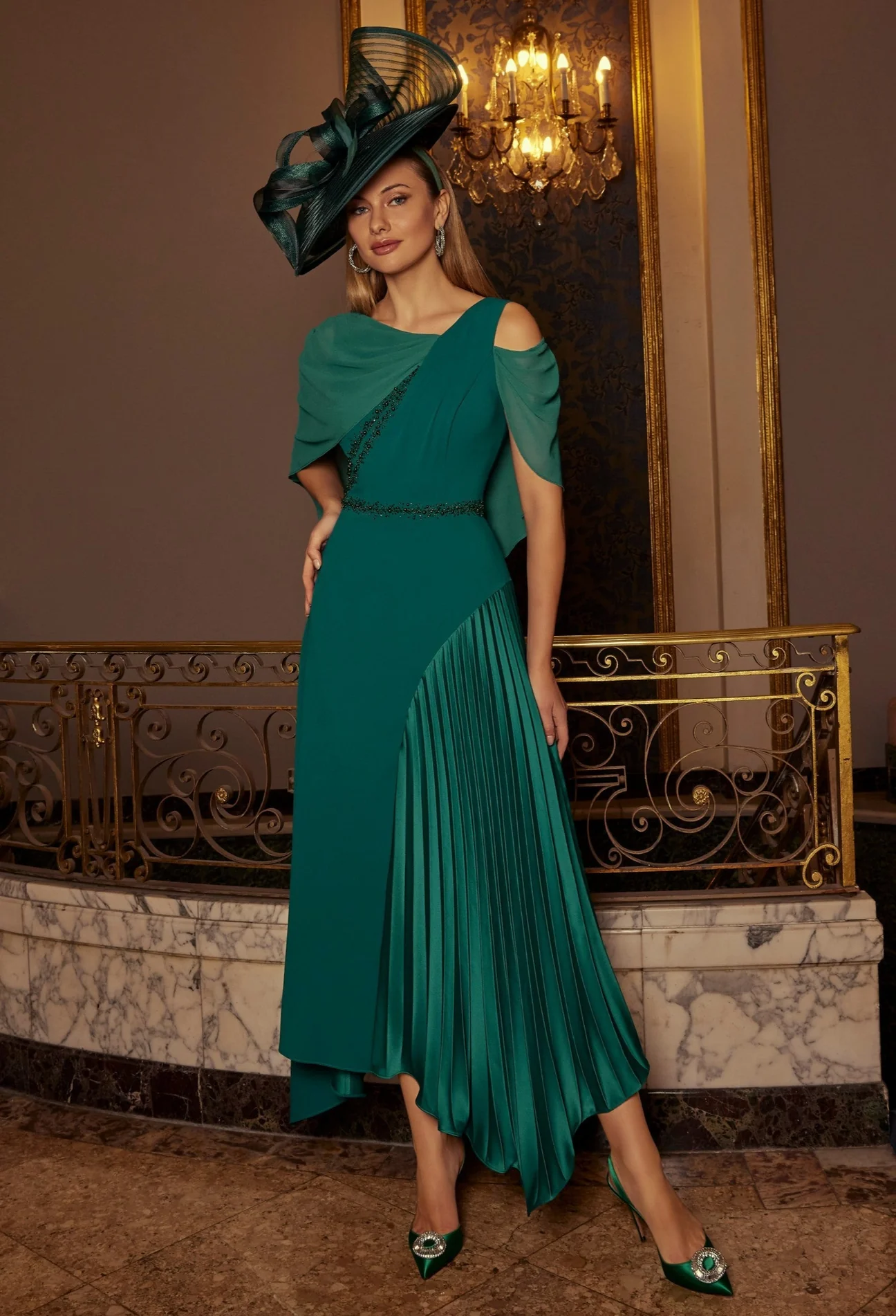 Veni Infantino 992566 Teal Crepe & Chiffon Asymmetric cut dress with beadwork and pleating