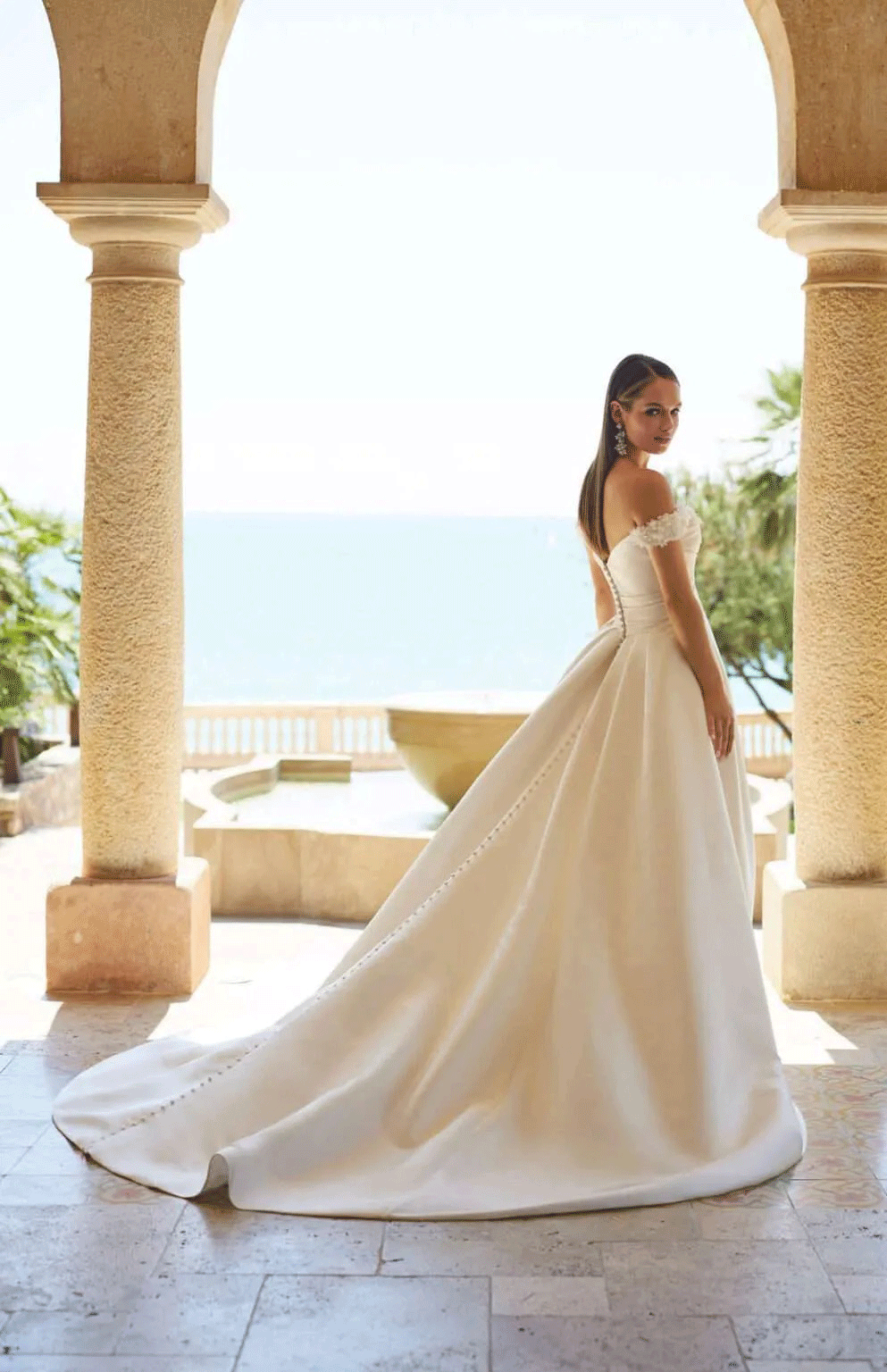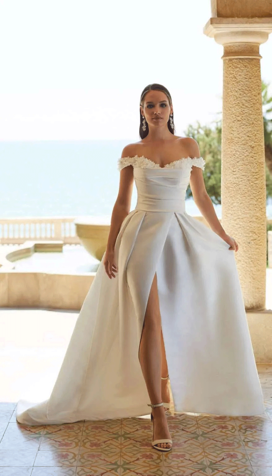 Yoneko is both classic and fashion-forward. The structured bodice and Mikado fabric give it a refined, sculpted quality, while the floral cap sleeves and thigh-high split bring softness and drama. It’s perfect for someone who wants to make a statement, but with timeless elegance.